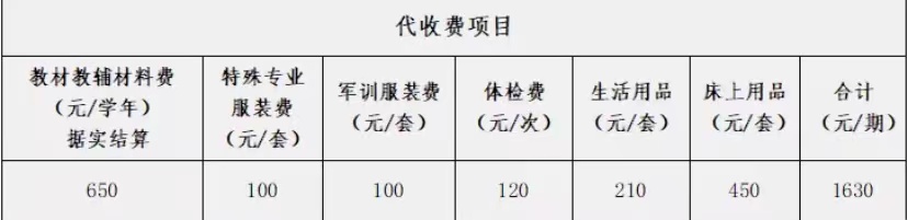 (三) ⽣活费: 学校严格按照物价部⻔审批标准执⾏, 实⾏刷卡消费, 每⽇ 刷卡限额 50 元。 (四) 城镇居⺠基本医疗保险费: 按照当年的居⺠医保参保相关⽂件规定 执⾏ 。 (五) 热⽔费: 实⾏刷卡消费, 开学初, 学校已免费为学⽣充值 50 元。 (六) 床上用品:学校为新⽣提供全套床上⽤品 (垫被 、盖被 、被套 、床单 、枕头、凉 席) 及⽣活⽤品, 根据⾃愿选择原则购买, 按出⼚价格据实收取 。学⽣报到⼊校 时带换洗⾐物即可。 (七) 校服: 夏季 90 元/套; 秋季 130 元/套; 冬季 145 元/件。 (⼋) 学平险: 100 元/学年; 线上平台缴费。