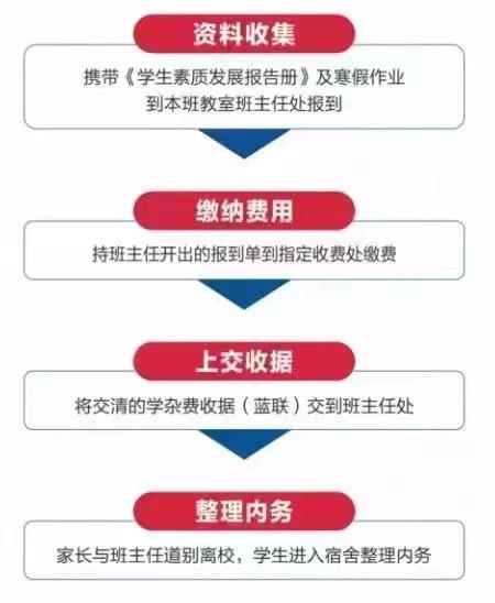 新春伊始,万象更新。在这春暖花开之际,最好的遇见便是“久别重逢”,新学期,新期待,让我们一起奋发向上、蓄力逐梦,以全新的姿态乘风破浪、大展鸿“兔”!为让孩子做好入学准备,更快适应学校学习和生活,现将相关事宜与您沟通如下: 一、报到时间 2023年2月6日(正月十六),当天正常晚自习。 二、报到程序