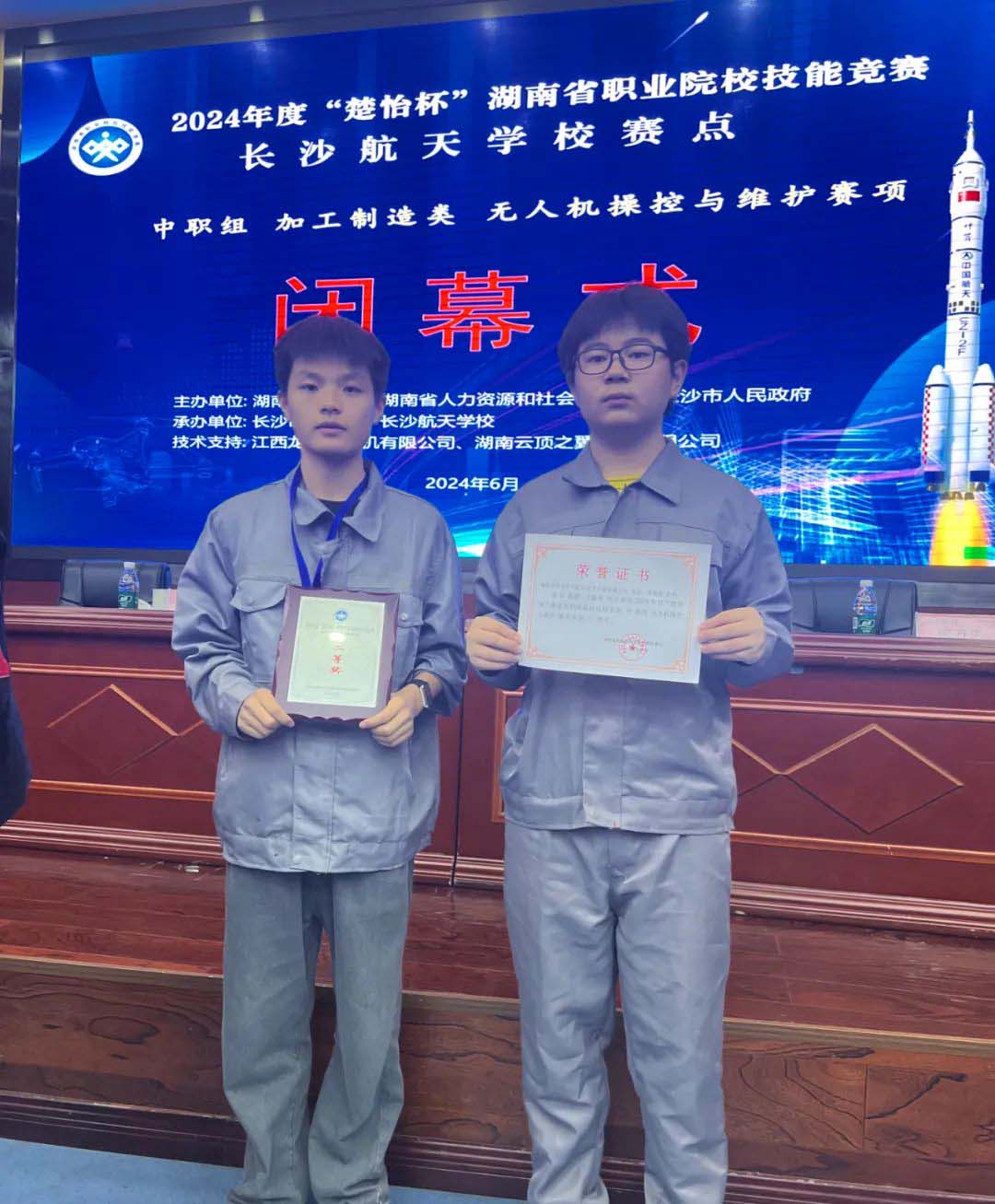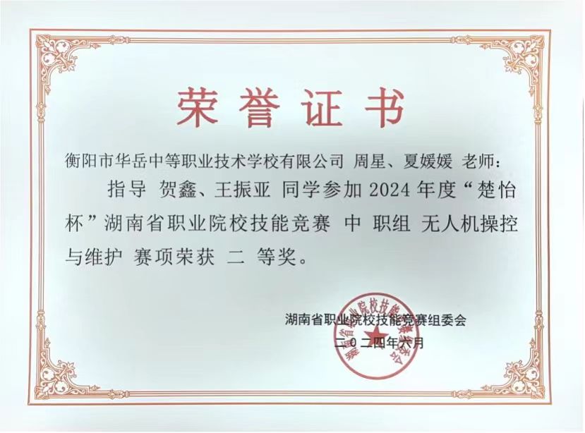 2024年6月18至19日,2024年度“楚怡杯”湖南省职业院校技能竞赛无人机操控与维护(中职)大赛在长沙航天学校举行,来自湖南省各市州的25支队伍50名选手参加本次比赛,比赛分为理论赛和操作赛。经过紧张激烈的比赛,我校同学贺鑫、王振亚同学荣获二等奖。