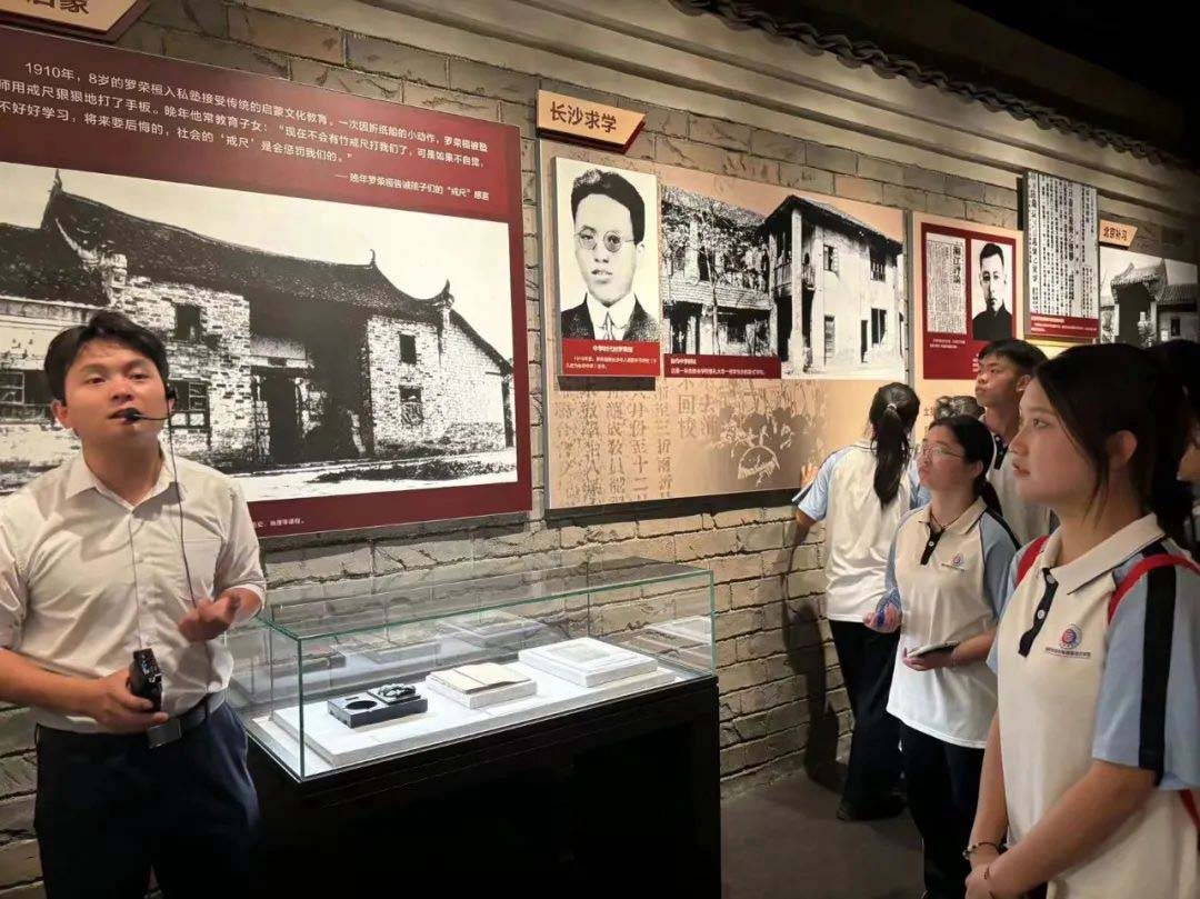 罗荣桓铜像纪念广场,全体团员一起重温了入团誓词,并对罗荣桓元帅铜像致以最崇高的敬意。 在讲解员的带领下,参加研学的优秀学生及学生干部参观了罗荣桓元帅生平事迹陈列馆和罗荣桓同志故居。通过一段段文字、一幅幅照片、一件件元帅身前使用的实物,蜡像场景等,学生们深切感受到革命先辈英勇顽强的战斗精神和伟大的革命情怀。