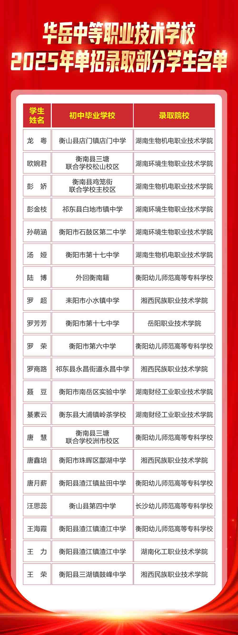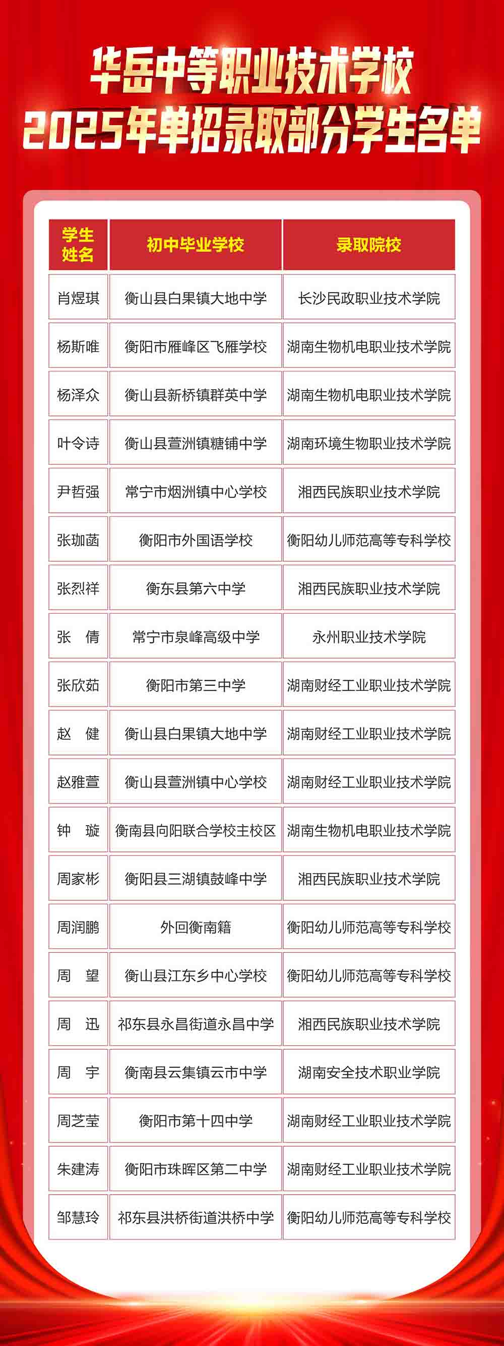 华岳中等职业技术学校2025年单招部分录取学生名单 春风唤醒繁花,汗水迎来硕果。华岳中职高三学子在单招考试中发挥出色,取得了优异的成绩, 在此,我们向所有取得优异成绩的同学们表示最热烈的祝贺,对辛勤付出和悉心教导的教师表示衷心感谢。 让我们共同为这些优秀的学子喝彩,期待他们在未来道路上继续绽放光芒! 在此,向取得优异成绩的同学们以及家长表示热烈祝贺,恭喜你们收获了成功的喜悦,迈入下一个阶段,你们的生命会更加精彩!同时也预祝明年的学子们奋发向上,再创佳绩! END 供稿|招就处 美编|徐薇涵 一审|徐薇涵 二审|罗淑银 三审|黄春来 终审|李 瑾 咨询热线:0734-8596333 投诉电话:0734-8907000 |